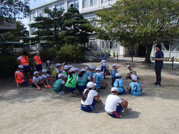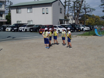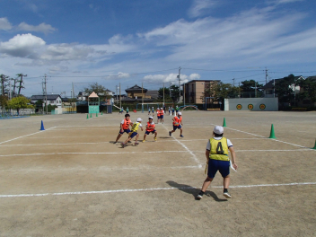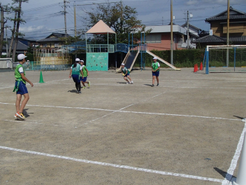 5年生は「フラッグフットボール」の学習をしています。先週までは体育館で基本的な練習を行っていましたが、今日は運動場で班対抗の試合も行われました。