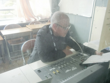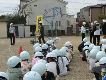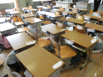 訓練地震発生の合図がありました。ダンゴムシの形になって、頭部を守ります。