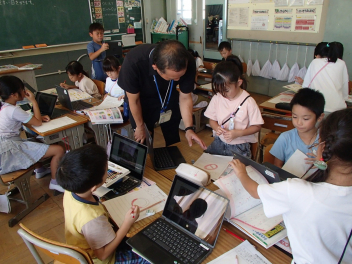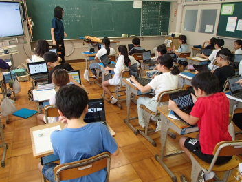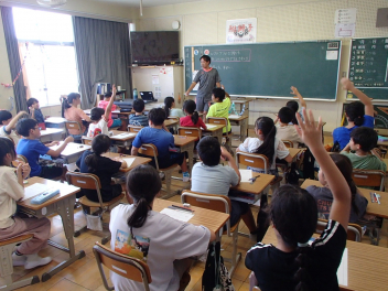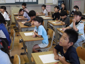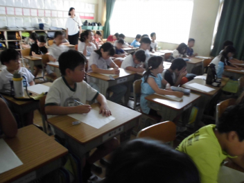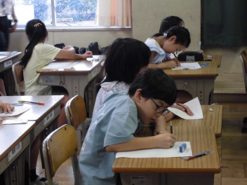 教師が大型テレビに書き方を映し、子供たちはそれに合わせてゆっくり丁寧に書いていきました。