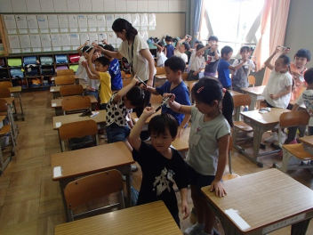 エクササイズ「ETになろう」は、二人組を作って1本のペンをそれぞれの人差し指で支え、立ったり座ったりします。一人が1回転するということにも挑戦しました。難易度が上がるほどに子供たちもチャレンジ精神が強まり、ペアになった人と声をかけ合いながら、動いていきました。