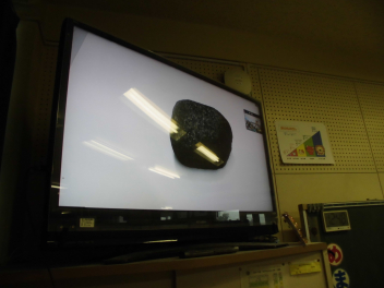 隕石とはどういうものかということから丁寧に教えていただき、静岡県に落ちた隕石は、この笹ケ瀬隕石だけであることを知った子どもたちは、とても嬉しそうな様子でした。さらに、本物の笹ケ瀬隕石を画面上でじっくり見せていただきました。「隕石には磁石がどれくらい付くんですか。」、「隕石はどれくらい固いんですか。」など、興味津々に質問をする子どもたちに、磁石を付けたり、軽くたたいて音をきかせてくださったりと、実際にその様子を見せながら教えて下さいました。