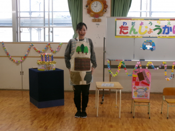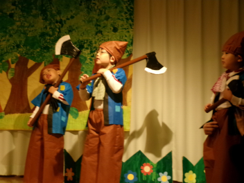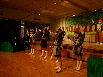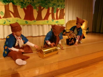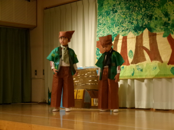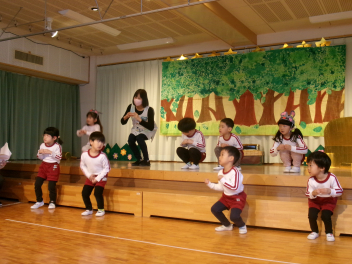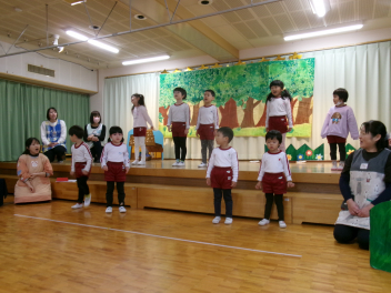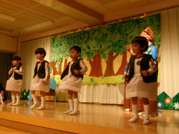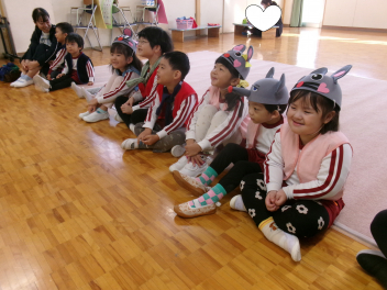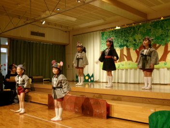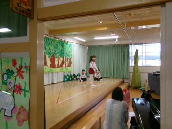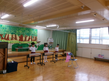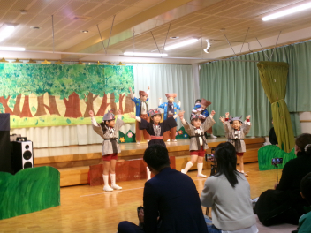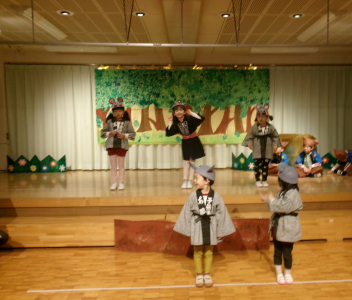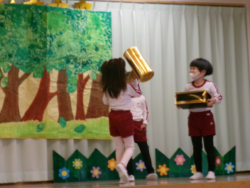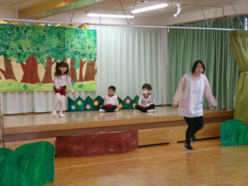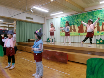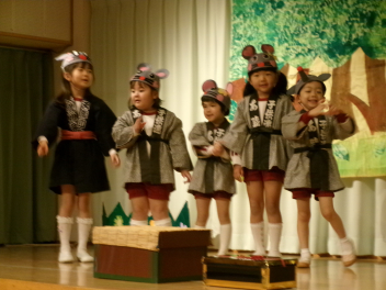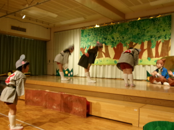全園児で行う「オペレッタおむすびころりん」みんなで元気よく歌をうたったり、台詞をいったりしながら、お話に合わせて進めていきました!!どの子も役になりきって、声の大きさや雰囲気を変えて行ったり、動きも自分なりに表現したり、とても楽しいオペレッタになりましたfrown