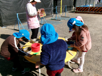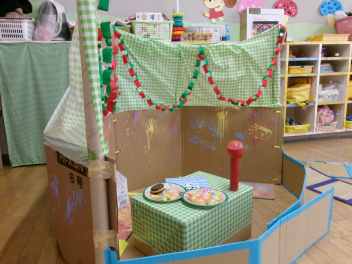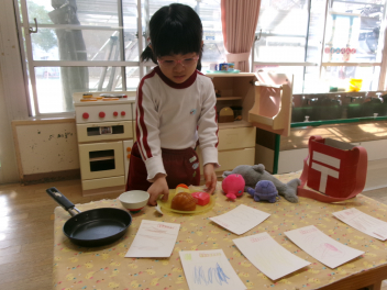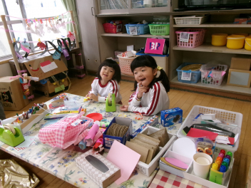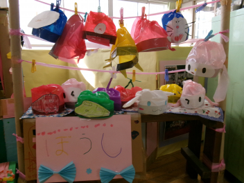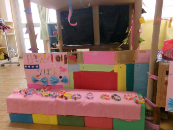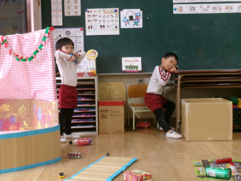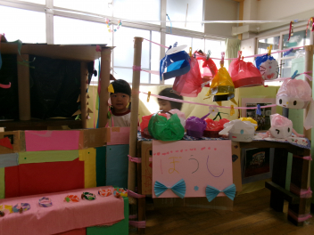 お店屋さんで売る物が増えていました「お店屋さん楽しみだね!!」と声を掛けると「またお店屋さんやる時にお金持ってきてね~!!」と嬉しそう!!生活発表会が終わったら、オープンする予定だそうですfrown