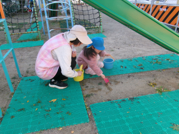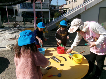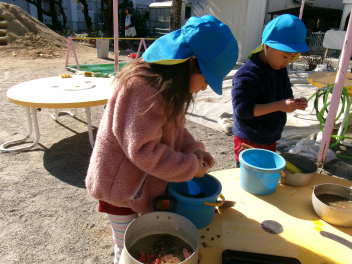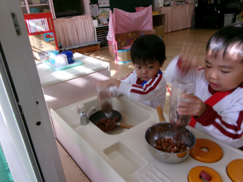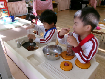 満足した様子でしたが、「今日つかった黒い実は、つぶしてみたら赤だったから、隠し味にならないな~」と次回も挑戦するようです!!こんな遊びも楽しんでいます明日はどんな遊びが展開されるかな~!!楽しみだね