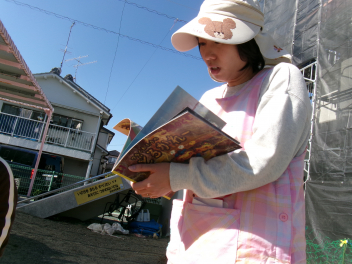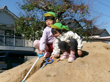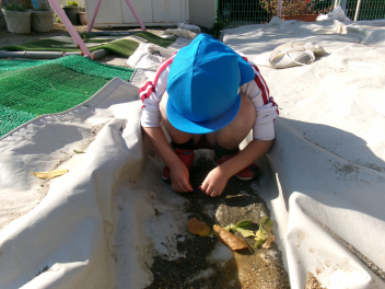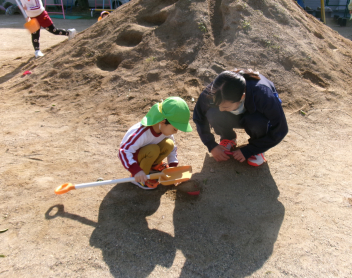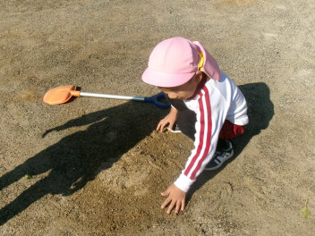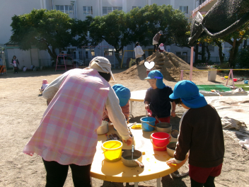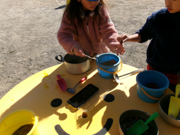 「よ~し!!絵本を見ながらつくってみよう!!」「まずは、すべりだいのしたのすな」「つぎは・・・」と作り、「う~ん!!これでいいかな!!」とみんなで確認!!今日のどろかれーは、どうだったのでしょうか!!