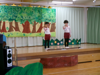 繰り返し練習をしてきたのが、本番に出ていましたねfrownバッチリOKでした少ない人数で、一人の出番が多い中、本当によく頑張ったぞう組さんですfrown今回の発表会を通し、大きな自信につながったと思います!!残りの幼稚園生活を存分に楽しんでいこうね