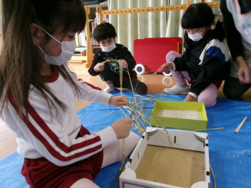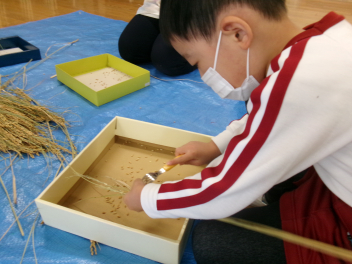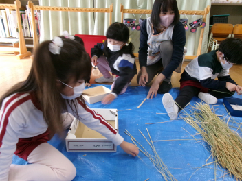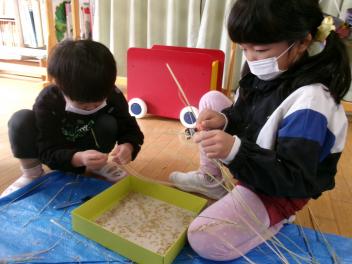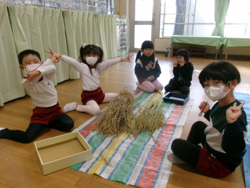 その後は、ぱんだ組さんとぞう組さんで「脱穀」をしたり、うさぎ組さんは、園庭で遊んだりしました