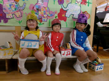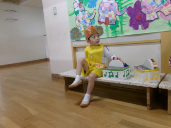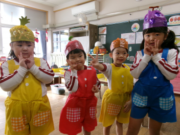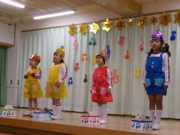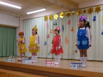 歌に合ったカラフルな衣装でリズミカルに歌ったり、楽器を鳴らしたりしました歌に合わせて踊りを考えて、友達と触れ合いながら、元気いっぱい行っていましたfrown自分たちで作った、果物帽子もお似合いです