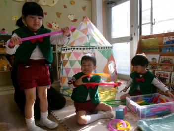 年中ぱんだ組さんは、「ふしぎなポケット」「ぼくのミックスジュース」「とんでったバナナ」です楽器は、タンバリンと鈴を使いました