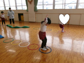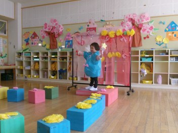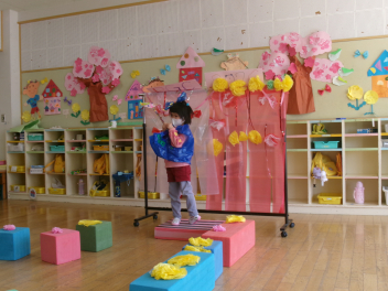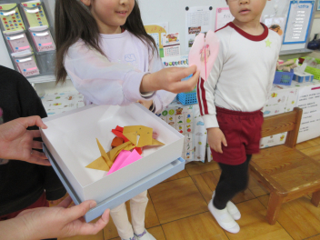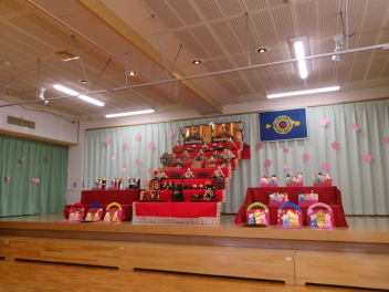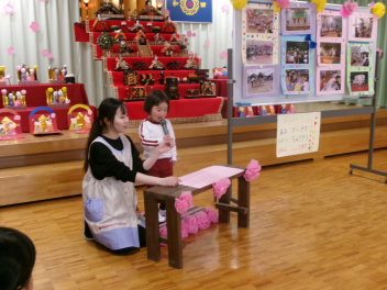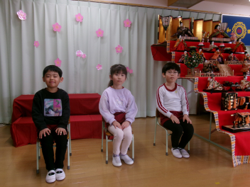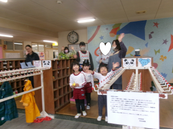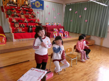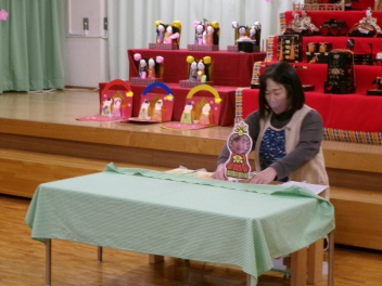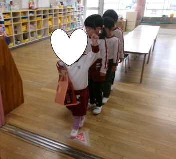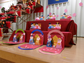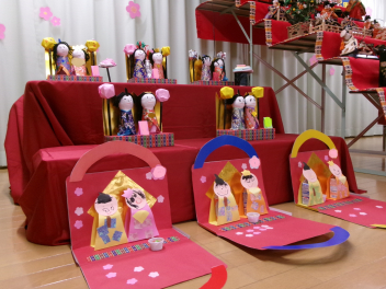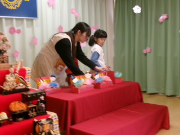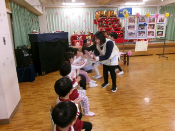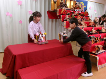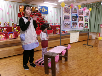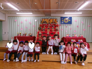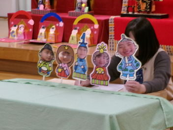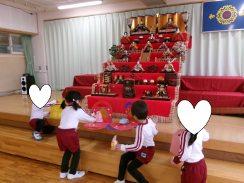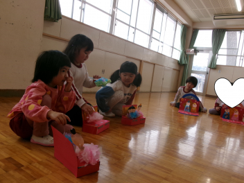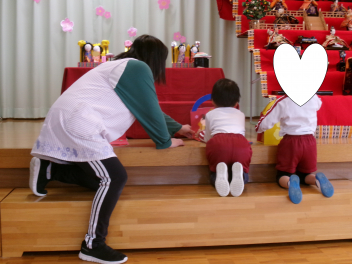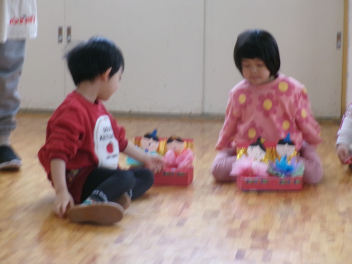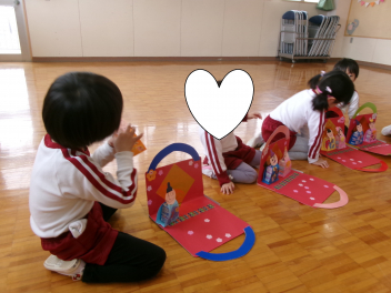 最初は、遊戯室へレッツゴー!!自分たちが作ったお雛様を持って、遊戯室のお雛様に会いに行きます