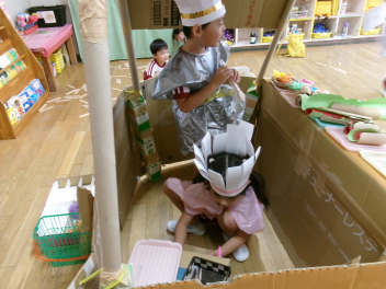 「ちょっと中を見せてくれるかな~?」とぞう組さんに声を掛けていました!!「いいよ~!!」と快く車の中に入れてくれました!!「これは、ハンドルだよ!」「これは電子レンジ!!」と色々詳しく教えてくれました!!