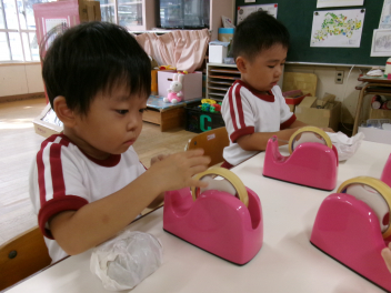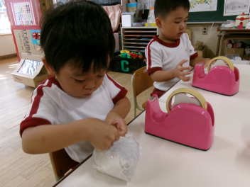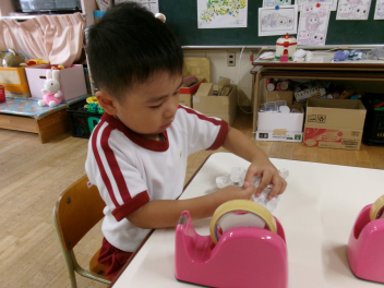 そして休み明けの今日・・・うさぎ組さんでは、「テープ」を使ってのおにぎりづくりです