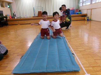 初めに年少うさぎ組さんです!!準備体操をしてから、マット運動・鉄棒を行いました!!