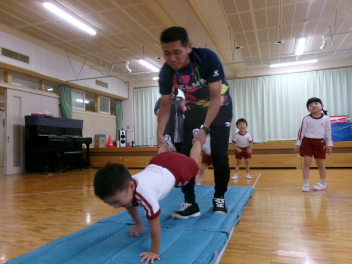 講師の先生が大好きな子どもたちlaugh積極的に挑戦します!!先生のお話をしっかりと聞いて、マットの上で段々前回りが出来るようになってきました!!マットの上で前回りが出来るようになると、鉄棒でも前回りが出来るようになっていきます!!少しずつ挑戦してみようねlaugh