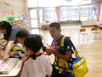 講師の先生。帰りがけにうさぎ組さんの「おにぎり屋さん」に寄ってくれました!!「梅干しおにぎりと鮭おにぎり」を食べて行ってくれました!!ありがとうございました