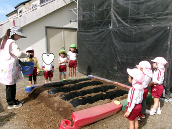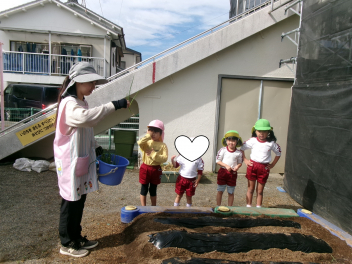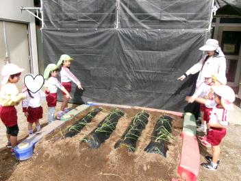 段々外が明るくなってきた頃、うさぎ組さんとぱんだ組さんで「玉ねぎの苗」を植えました!!