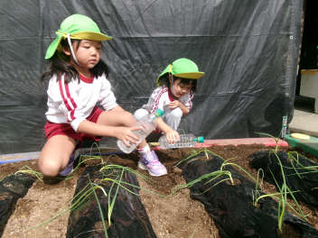 苗の匂いをくんくんblush「あっ!玉ねぎの匂いだ!!」と驚きです「大きくなあれ!」のおまじないと、たっぷりのお水を掛けました!!これからも生長を見守っていこうね!!