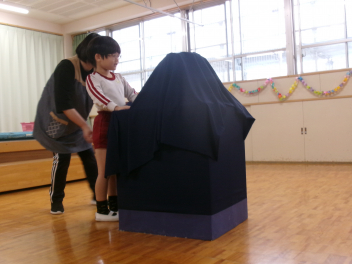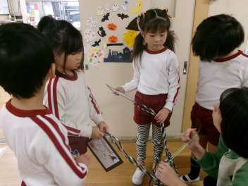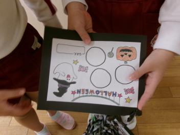 「あっ!!カードが入ってる!!ハッピーハロウィンって書いてあるよ!!」「今日のパーティーで使うカードじゃない?」「まって数えてみようよ!」「1・2・3・・・・16個ある。」「園長先生、和田幼稚園はみんなで何人だっけ?」「16人です。」「あっ!じゃあやっぱりパーティーのカードだ!!」と、更にワクワクが