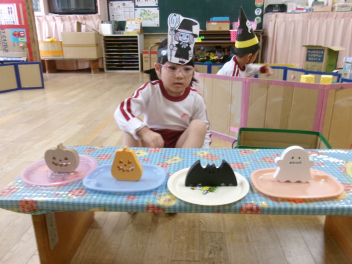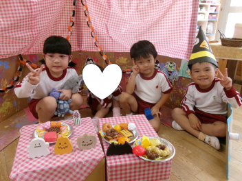 そしてその後も・・・ぱんだ組さんが、「トリック・オア・トリートお菓子をくれないといたずらしちゃうぞ!!」とうさぎ組に顔を出しました!!「お菓子はないけど、おにぎりどう??」と今度はぱんだ組さんとおにぎりパーティーです