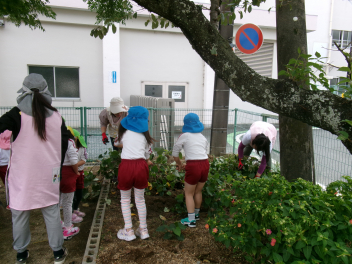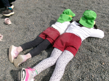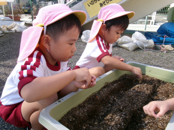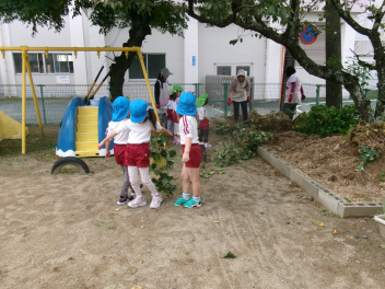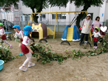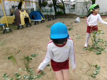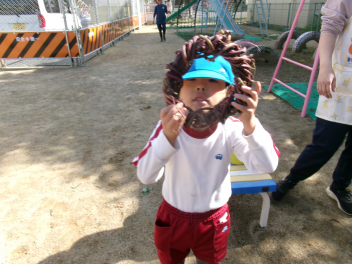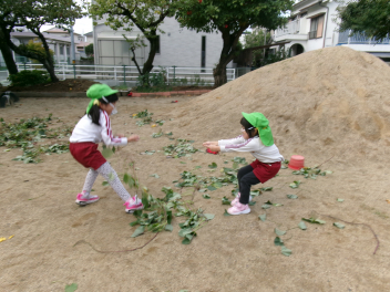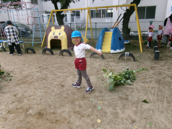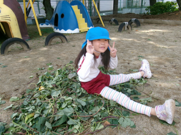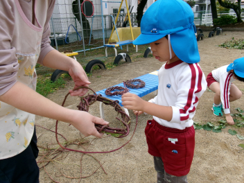 木の実を探したり、走ったり、砂利で遊んだりしました。たっぷり遊んだら、幼稚園に戻って、サツマイモのツルで遊びました