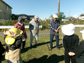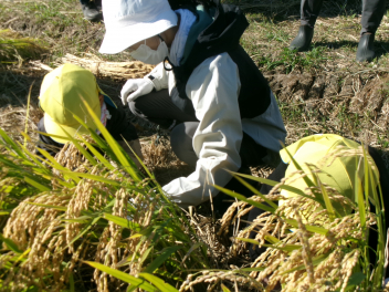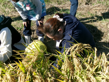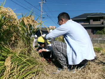 地域の「田んぼの先生方」に挨拶をし、稲刈りのやり方を教えてもらったら、稲刈りスタートです!!