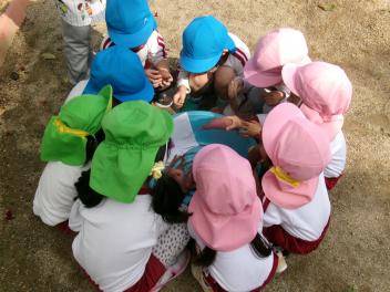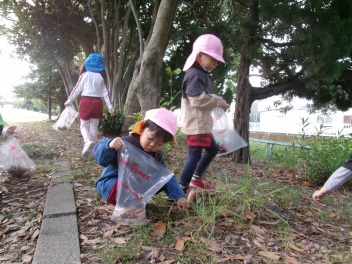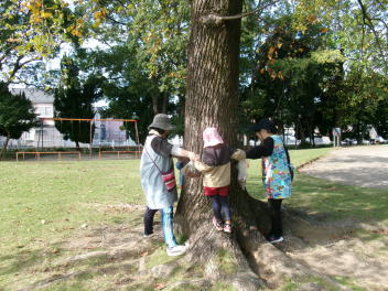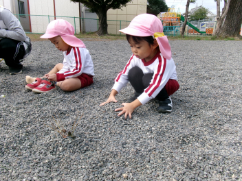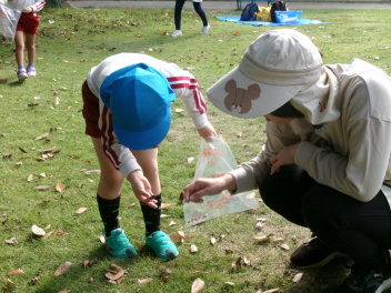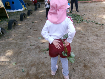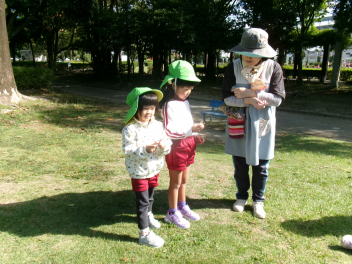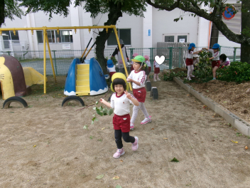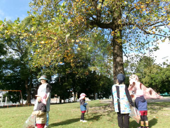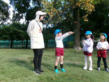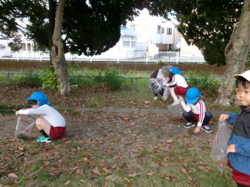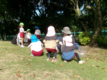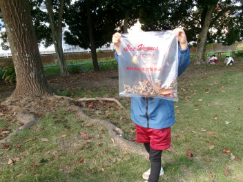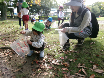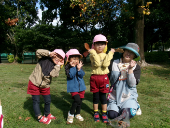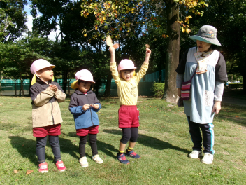 初めに先生のお話を聞いたら、木の実やどんぐりや葉っぱ探しです!!公園には、たくさんの秋の自然物が落ちていましたfrownどの子も夢中になって探します!!「あっ!この葉っぱハートみたい」「かわいい!小さな赤ちゃんどんぐりだ」「赤い葉っぱ見っけ!」「どんぐりの帽子がたくさんついてる枝発見」など、感動がいっぱいでした!