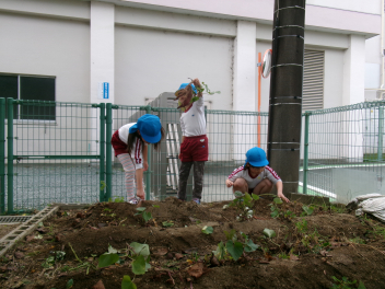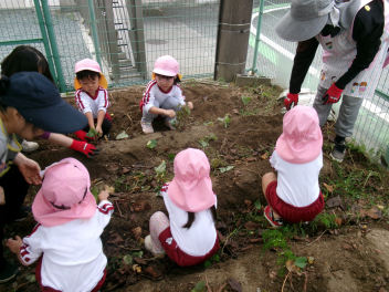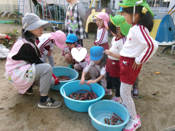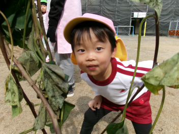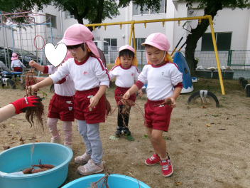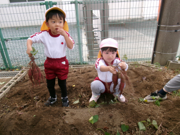 • 今日は幼稚園の畑のサツマイモを掘りましたfrown試し掘りをした時に、あまり芋がついてなかったので心配していましたが、今日掘ってみると、子どもたち分は掘れましたよ!!