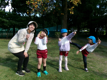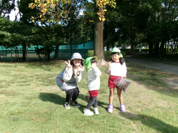 一旦集合したら、拾った自然物の中でみんなに紹介したい自然物をみんなの前で披露しました!「僕はこれです!どんぐりの帽子がかわいいのでこれにしました!」「私は、この葉っぱがつるつるしていたので、これにしました」「赤ちゃんどんぐりがかわいかったのでこれにしました!」などと、選んだ自然物の紹介をしました!!みんなで「ハイポーズ!!」