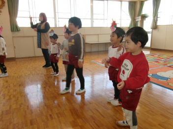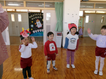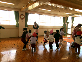 年少さんは、絵本「おにたくんのおにぎり」から、雲の車に乗っておにぎりを配っていました!!美味しいおにぎりをいただきました!!節分までに、色々な鬼遊びを楽しんでいますね!