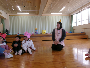 「自分のおなかの中には、どんな鬼が住んでいるかな?」と語りながら、今日は先生のお腹にいる鬼をみんなで退治しました