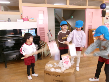 最後にねずみさんの力を借りて気合いを入れた園長先生が、木づちでお餅に「えい!えい!えい~!!」と打つと、「あっ!!2つに割れました!!」「やった~!!」「鏡開き成功!!」です