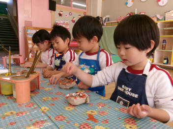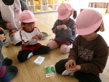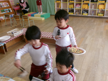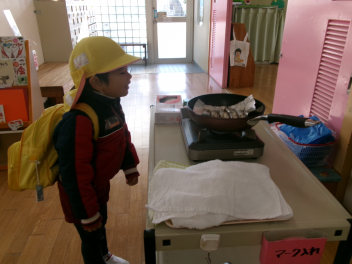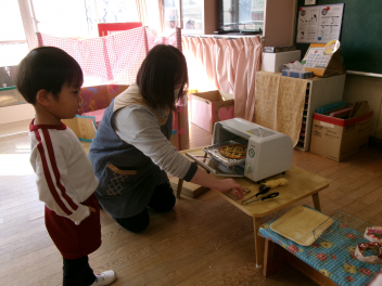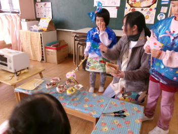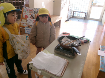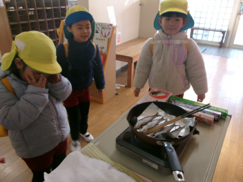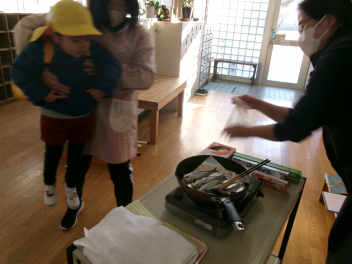 登園時に、玄関で焼きました!「あっなんだか魚の匂いがする~!!」「あれ~サンマの匂い!!」匂いにつられて、焼いている方へ・・・「これはサンマじゃなくてイワシだ!!」「いい匂いがするよ!!でも段々苦い匂いがしてきたね!!」「鬼さんも嫌がるかな~」とドキドキワクワク