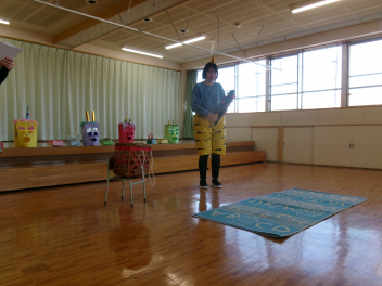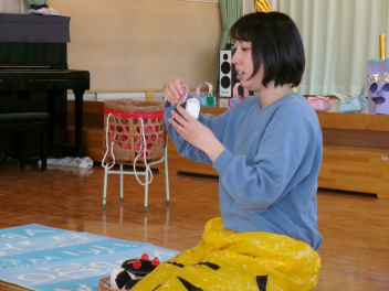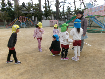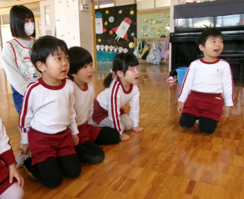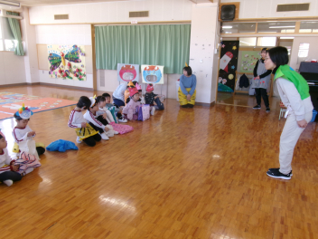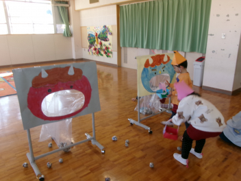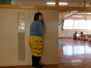 「自分のおなかの中には、どんな鬼が住んでいるかな?」と語りながら、今日は先生のお腹にいる鬼をみんなで退治しました