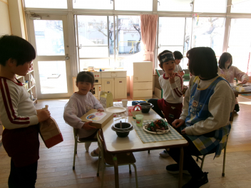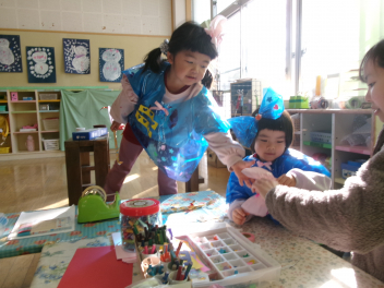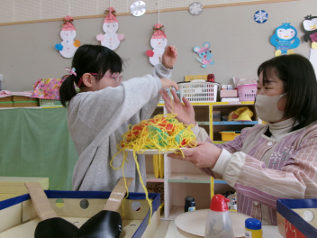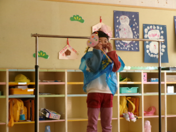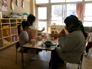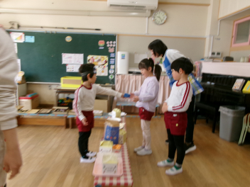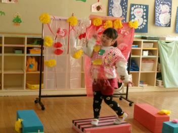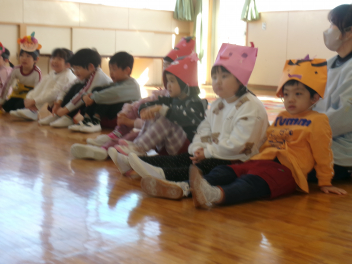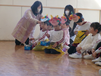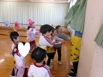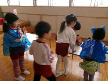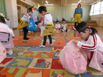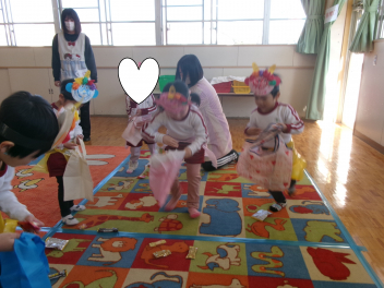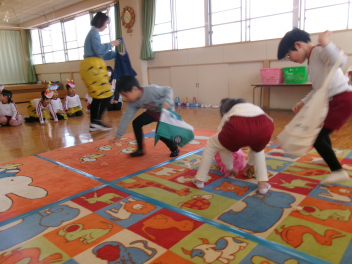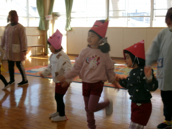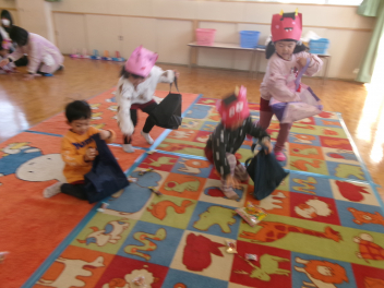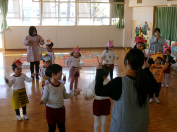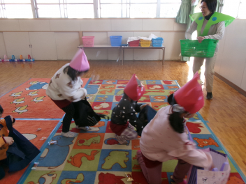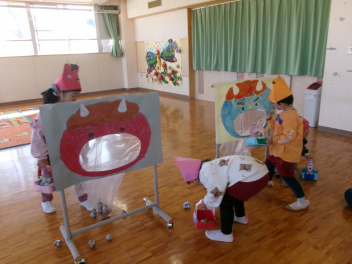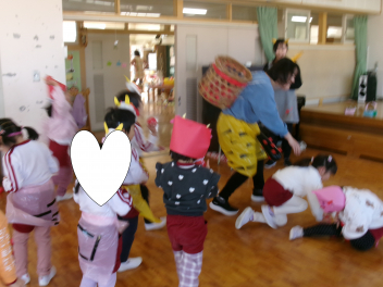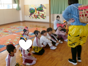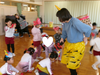 年少さんは、絵本「おにたくんのおにぎり」から、雲の車に乗っておにぎりを配っていました!!美味しいおにぎりをいただきました!!節分までに、色々な鬼遊びを楽しんでいますね!