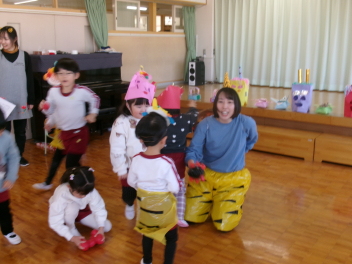 そして今日の「仲良しタイム」も、鬼のお面を被り、新聞紙豆を持って集合です