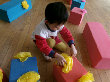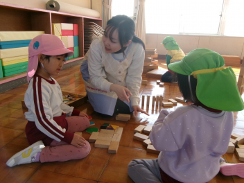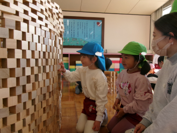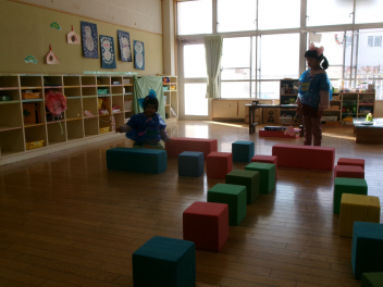 中ノ町幼稚園のお友達が待っていてくれました各部屋に荷物を置いたら、遊戯室でたくさんの積み木で遊びます