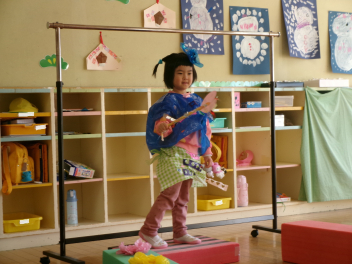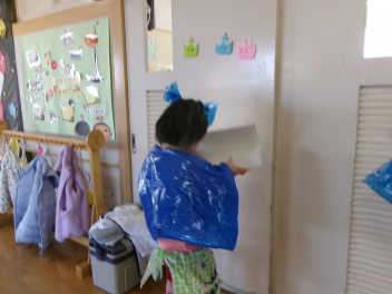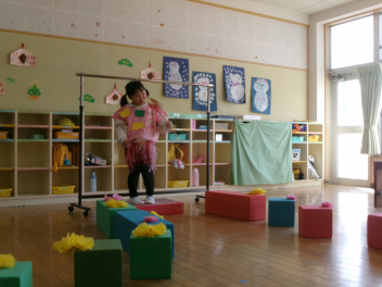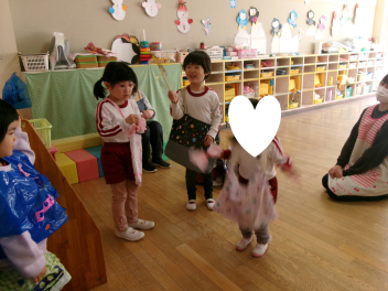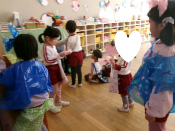 ぱんだ組さんも、ファションショーの準備中!!今日は「ランウェイ」を作っていましたfrown必要な物を1階にとりに来た時、うさぎ組さんで「ドーナツ屋さん」と「ショー」をやっているのを発見!!「何してるの?」と立ち寄ってみると、ぱんだ組さんの洋服を見たうさぎ組さんが「かわいいcheeky」と目が釘付けに!!