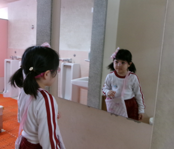 ささっと作って届けると、うさぎ組さんとっても大喜び!頭に付けたら、鏡の前に行きました