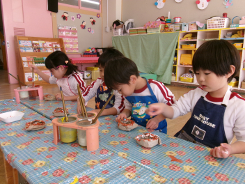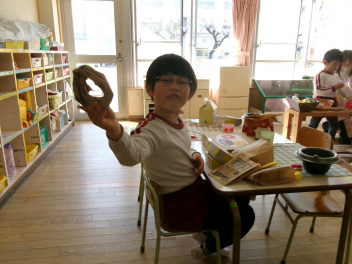 • 昨日、うさぎ組さんはドーナツづくりを楽しみましたそのドーナツを「ドーナツ屋さん」にして楽しんでいましたfrown