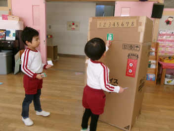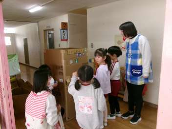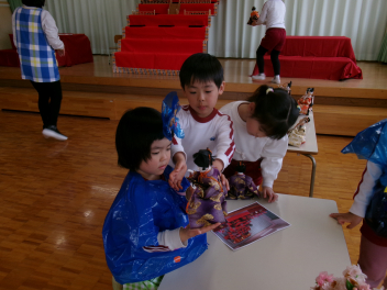 飾り方の写真を見ながら、みんなで「あっ!あそこだ!」「これはここ!!」「これはなんだろう!!」と声を掛け合って並べていました最後はぞう組さんが、ばっちり飾ってくれました