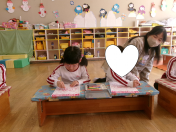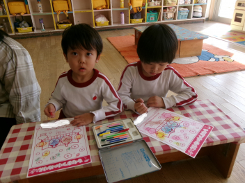 じっくりと見た後、お部屋に戻って「お雛様」の塗り絵を行いました!!