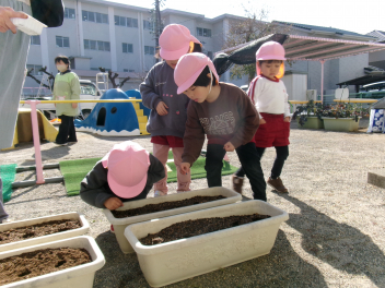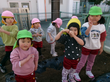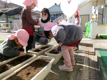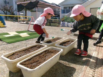 そして幼稚園では、うさぎ組さんが、昼食後に「スナップエンドウ」の種を撒きましたfrownじゃがいもやエンドウなど、ぱんだ組さんになってから収穫する野菜があり、とても楽しみですね水をたっぷりあげて、大きくなるのを楽しみにしましょうね!!