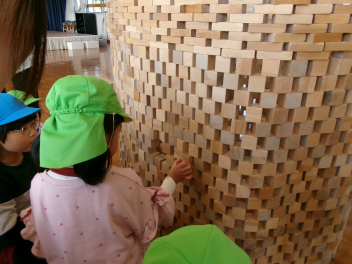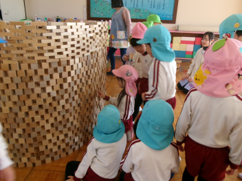 積み木でドームが作られていて、順番に積み木を一つ一つ外して、入口をつくります「倒れそうで怖い怖い!!」と言いながら慎重に外していきます!!成功すると「すごい~!!お~!!」と歓声があがります!!
