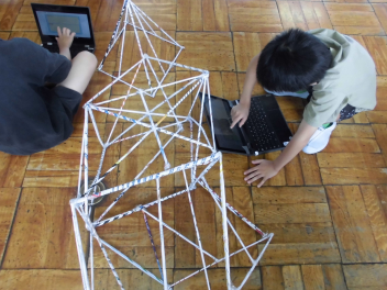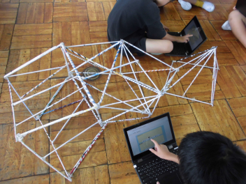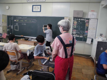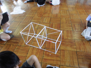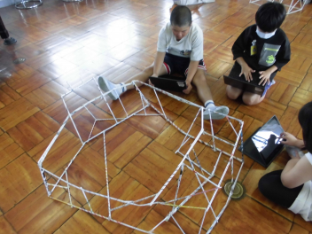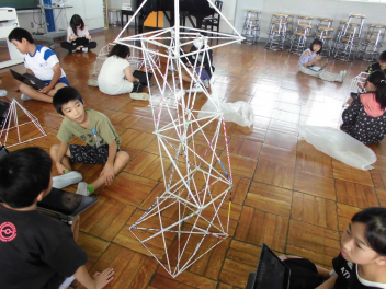 4年2組では、図工で制作した作品の鑑賞をしていました。紙を丸めた棒をたくさん作り、グループで協力して立体作品を作りました。今日は、タブレットを使って振り返りを書きました。