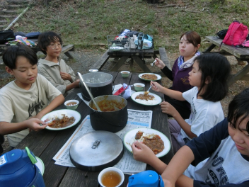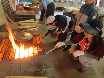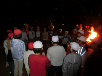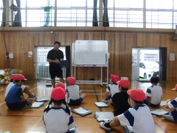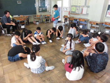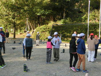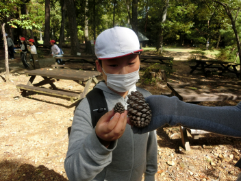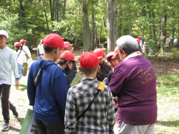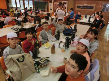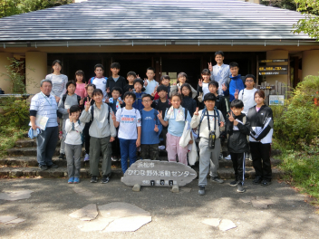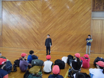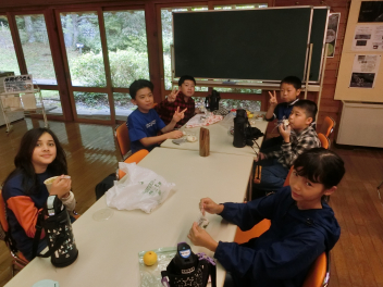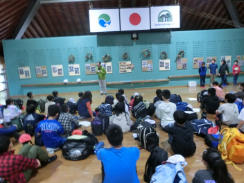 10時15分、みんな元気にかわな野外活動センターに到着しました。現在、霧のような雨が降っているそうです。入所式は体育室の中で行いました。