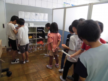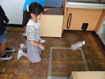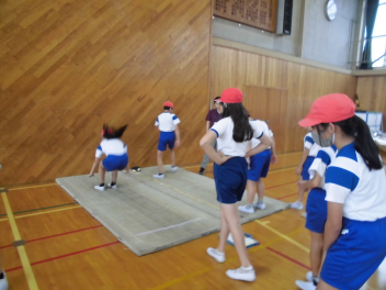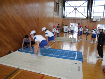 体力テストが始まりました。5年生が立ち幅跳びをやっていました。