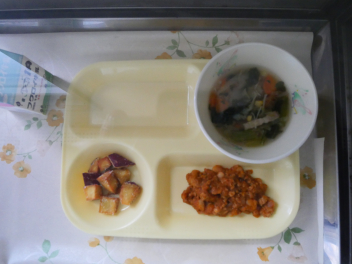 シュガーバターポテトは、大きめの四角に切ったさつまいもを油で揚げ、バターをからめ、グラニュー糖をまぶして作った給食室オリジナル料理です。さつまいもには、おなかの調子を整えてくれる食物繊維が多く含まれています。休み明けの子供たちの健康にはぴったりの献立ですね。友達と協力して配膳し、楽しく給食を食べることができました。