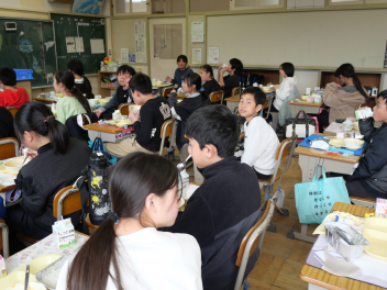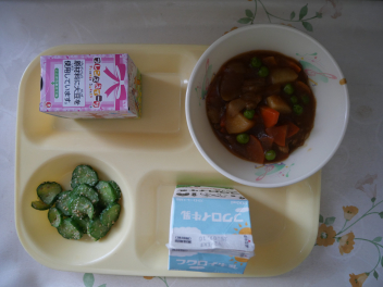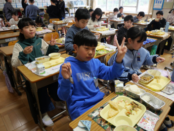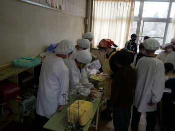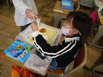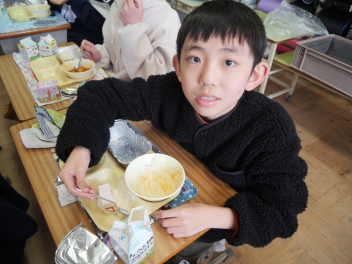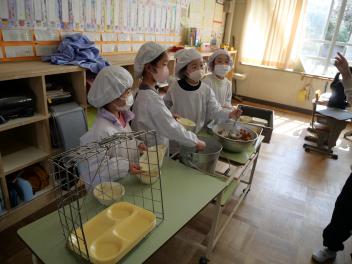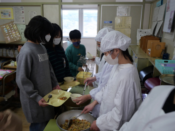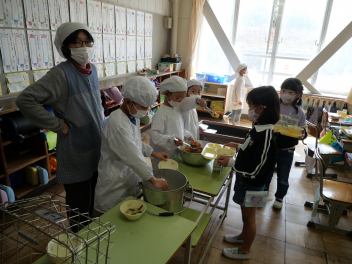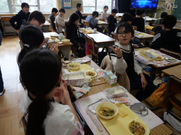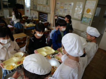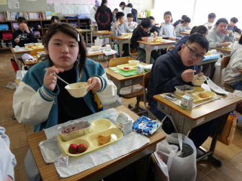 •  今日は、給食最終日でした。今日のメニューは、ご飯、牛乳、ポークカレー、きゅうりの浅漬け、お楽しみデザートでした。お楽しみデザートにミニケーキが出ました。食事は、栄養をとるだけでなく、一緒に食べる人とコミュニケーションをして、仲を深める役割もあります。5年生の教室では、子供たちは今年度最後の給食を楽しんで食べていました。
