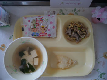 今日の給食は、ひな祭りの行事食でした。3月3日はひな祭りで、「桃の節句」とも言います。ひな祭りは、「女の子が健康に育ちますように」という願いが込められた行事です。ひな人形と桃の花を飾って、ひなあられやひし餅をお供えし、ちらし寿司やはまぐりのすまし汁を食べてお祝いをします。今日は、合わせ酢をご飯に混ぜて、ちらし寿司の具をのせていただきました。