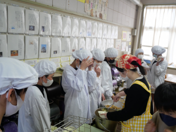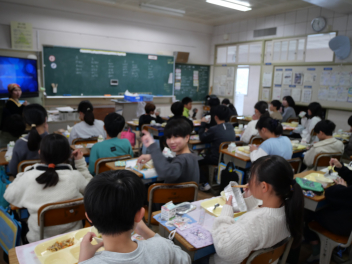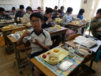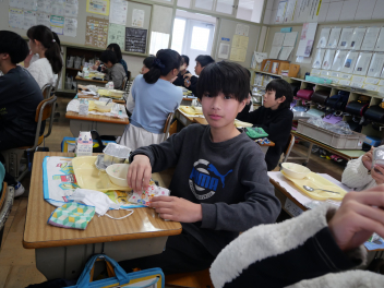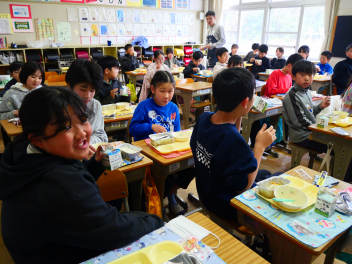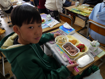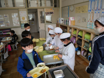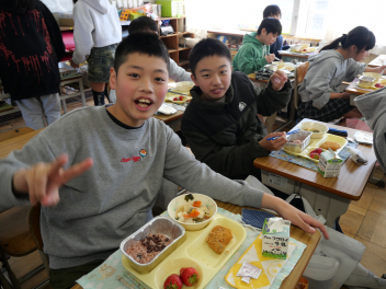 •  6年生の卒業を祝う献立の給食がありました。周りを海に囲まれている日本では、新鮮な魚が手に入りやすく、主食のお米と魚料理がよく合うため、お祝いの時に魚料理を食べる文化があります。また、成長とともに名前が変わる魚を「出世魚」といいます。ぶりも出世魚のひとつで、縁起の良い魚とされています。この日は、赤飯、ぶりフライ、具沢山汁、いちごのメニューでした。6年生の教室では、楽しそうに味わって食べていました。